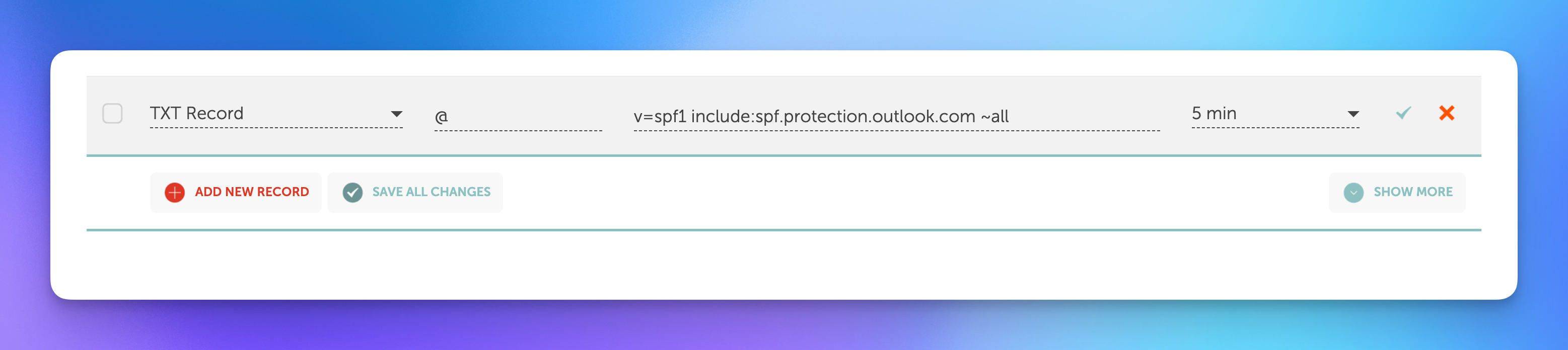 To update the existing SPF record, you will need to add include:spf.protection.outlook.com to the record's Value field.