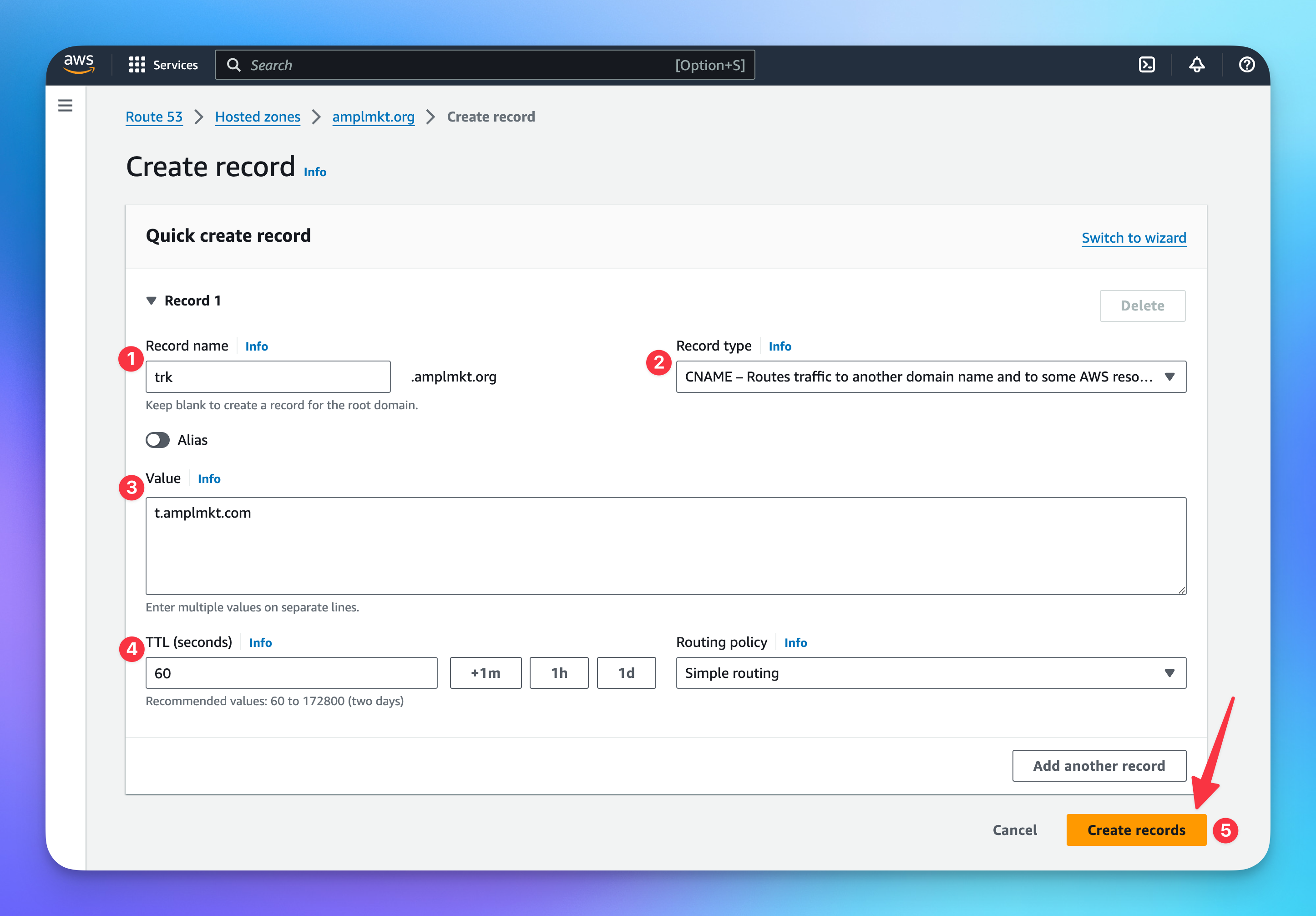 - Go to https://console.aws.amazon.com/route53/v2/hostedzones#, find your domain and click on it.