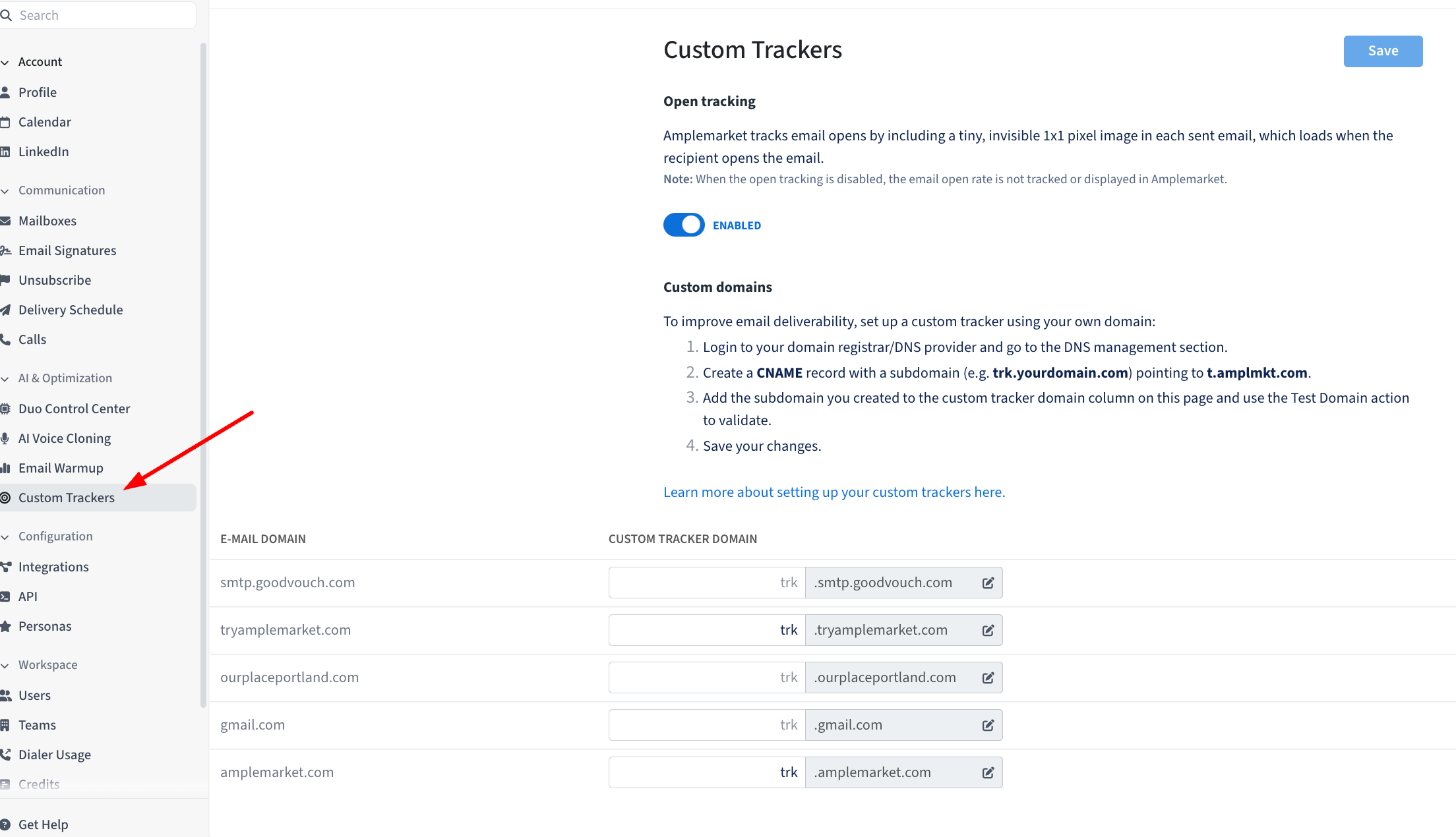 To customize Amplemarket's email open tracking pixel link to originate from your domain (instead of amplemarket's) follow the steps bellow.