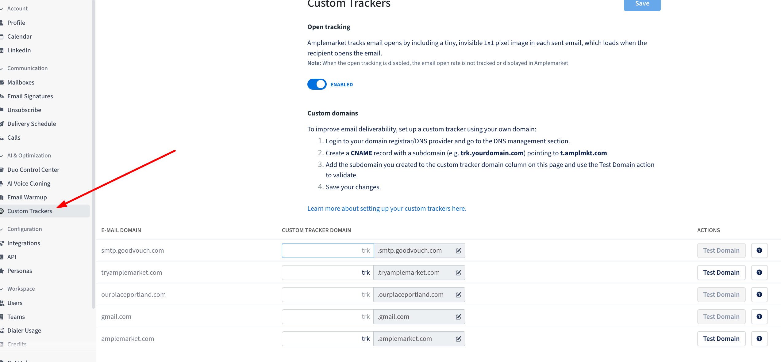To customize Amplemarket's email open tracking pixel link to originate from your domain (instead of amplemarket's) follow the steps bellow.