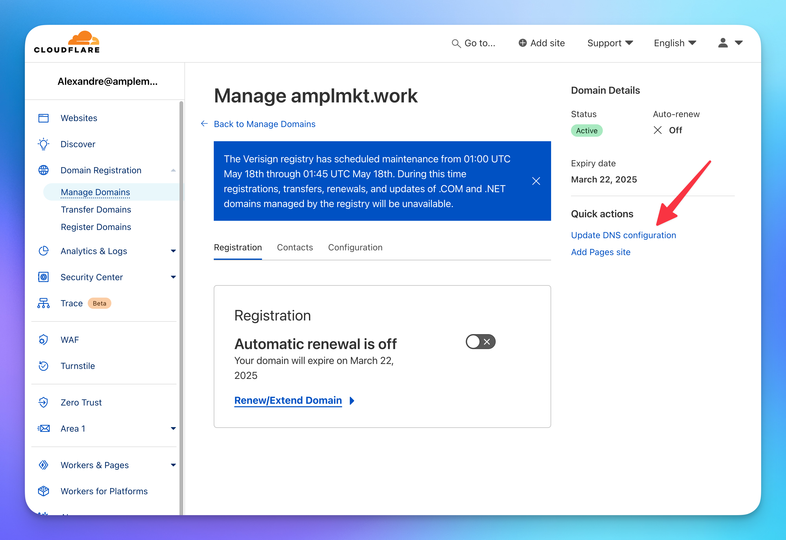 - Go to https://dash.cloudflare.com/, click on Domain Registration > Manage domains, find your domain and click Manage
