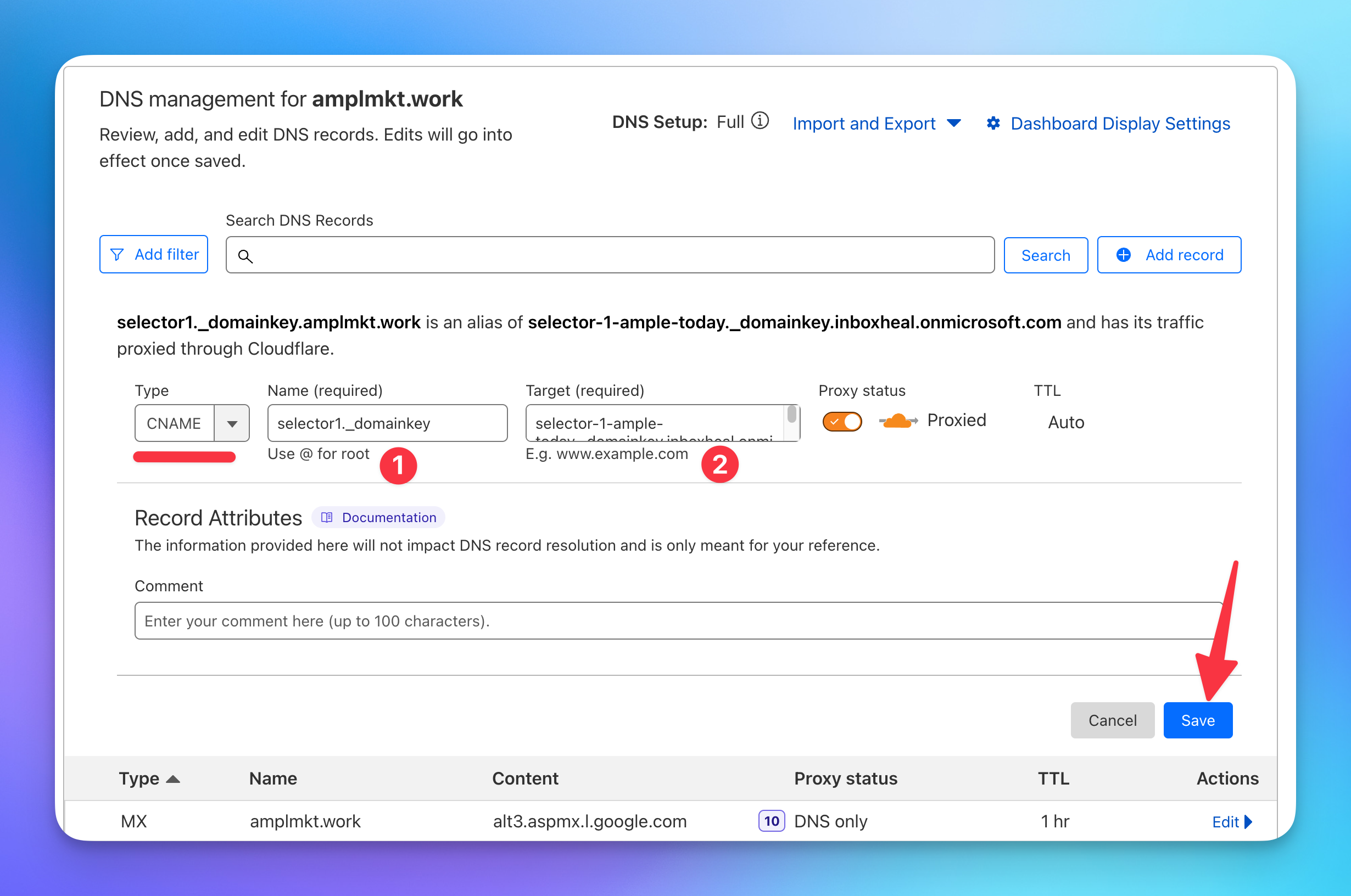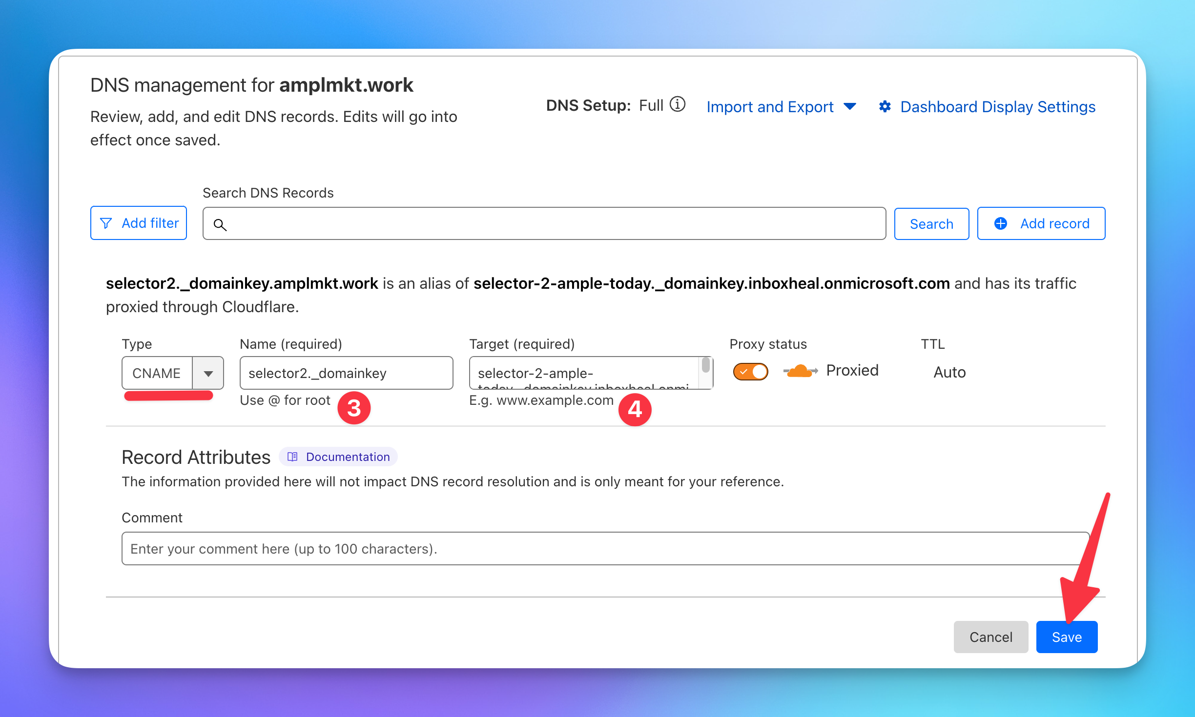 - Add a new DMARC record and save changes