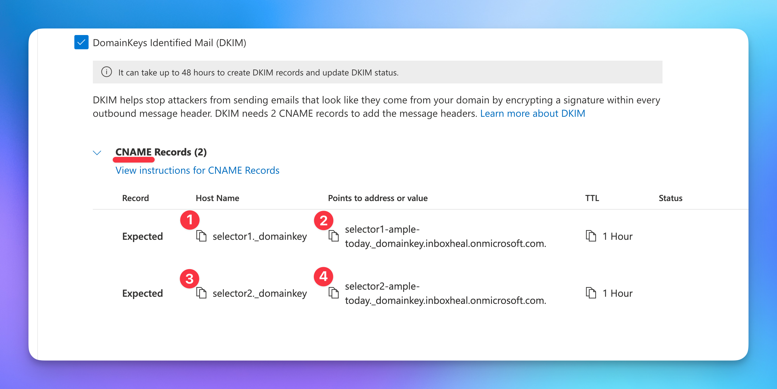 - Copy the DKIM records you just generated from Microsoft's