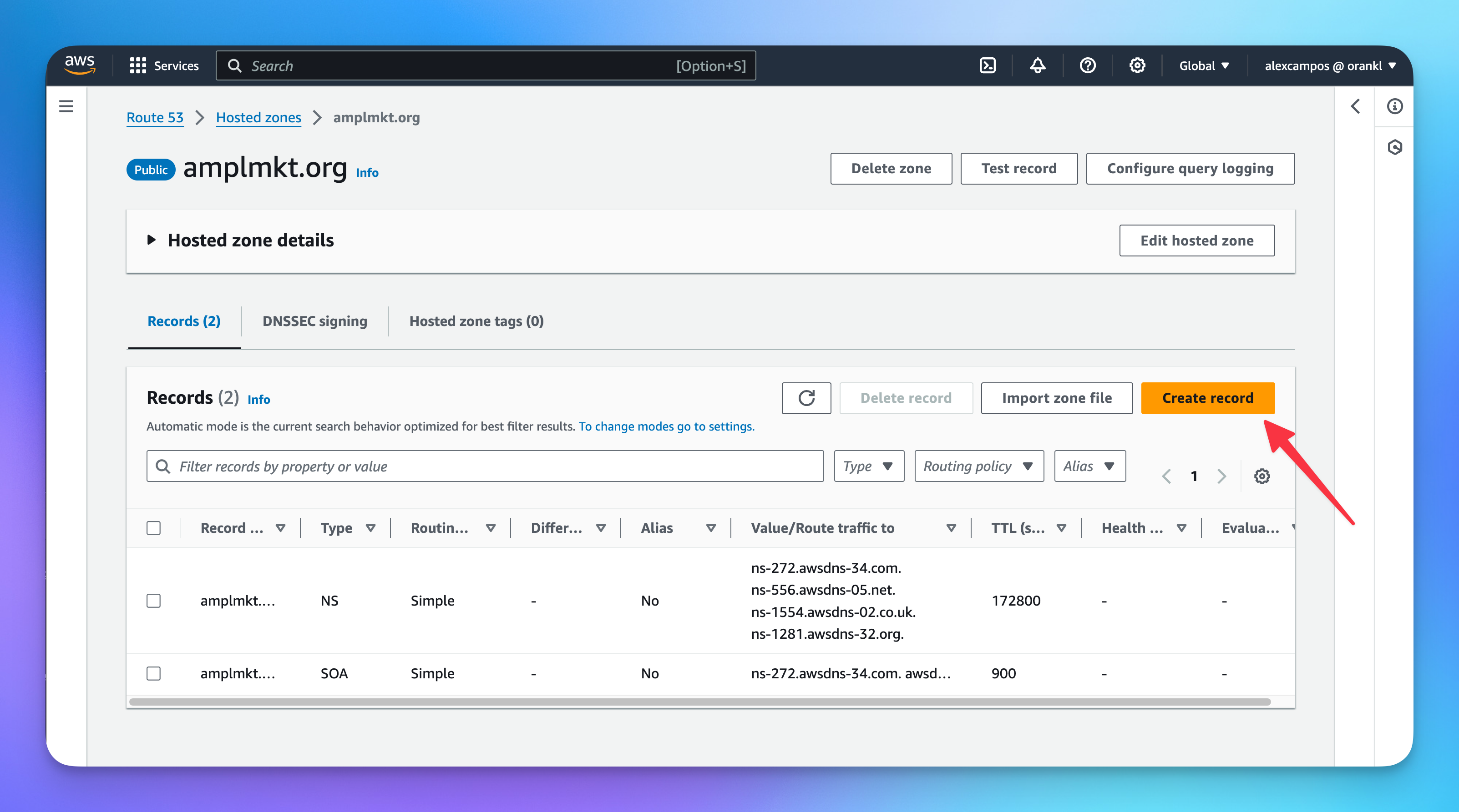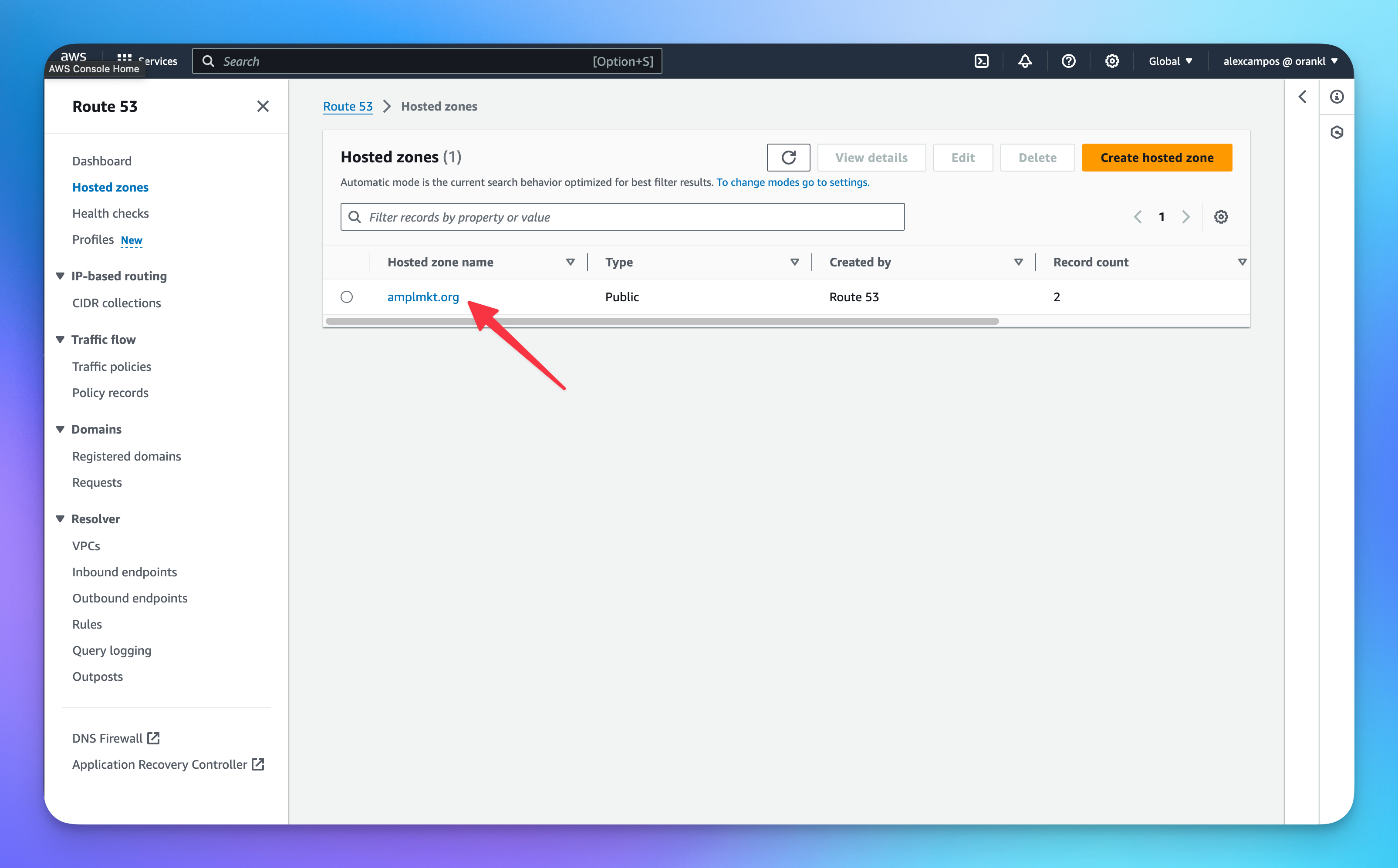 - Go to https://console.aws.amazon.com/route53/v2/hostedzones#, find your domain and click on it.