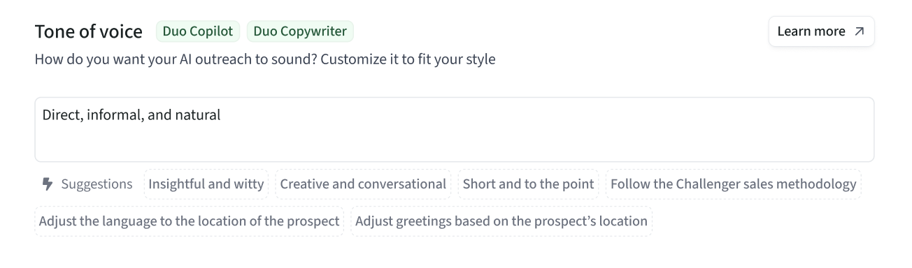 In Settings > Duo Control Center > Messaging Settings > Tone of voice, you'll see a second text field and this is where you should help Duo understand how you want your outreach to sound. Your preferred tone of voice, the specific sales methodologies or frameworks you like to follow and other pieces of information about yourself that will make Duo sound more like you.