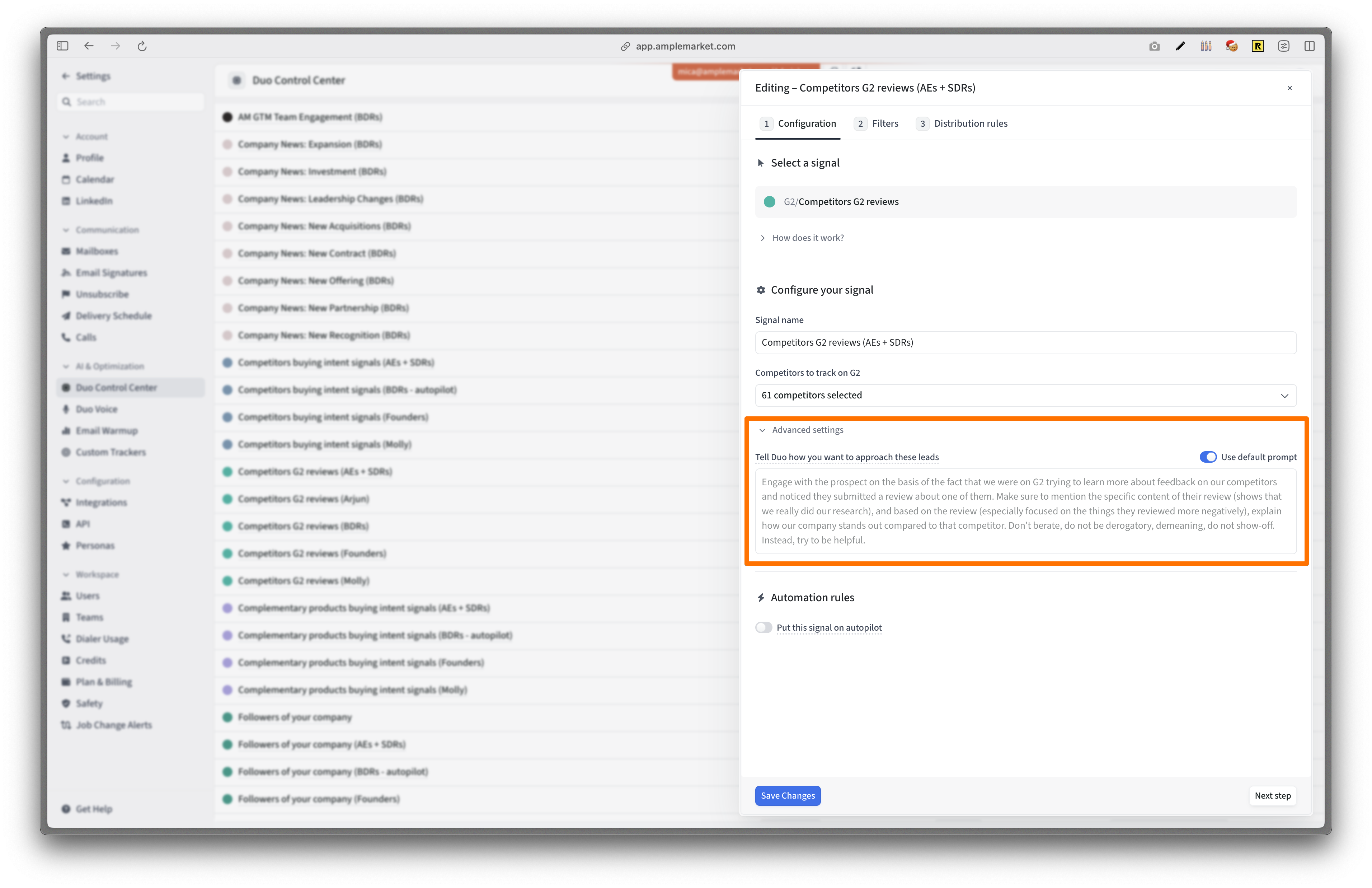 In Settings > Duo Control Center > Duo Copilot > Signals, click to open one of your signals. You'll see that in step 1 (Configuration) there is an advanced setting that allows you to instruct Duo on how to approach leads for that specific signal. All leads generated from this signal will follow the instructions specified in this prompt (in addition to your Messaging Settings instructions). You can think of this field as a description for the play you want to run for this specific signal. If you want, you can even change the structure of the sequences from the leads generated for this signal.