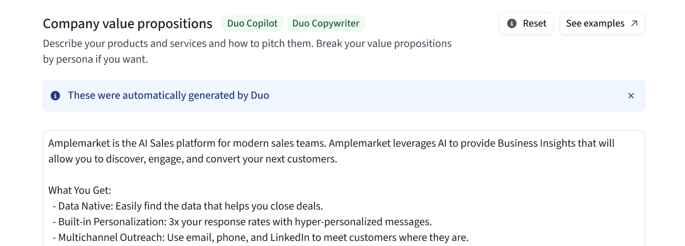 Your company value propositions: This is where you should specify how, in general, Duo should pitch your products and services, what social proof and testimonials to use and how, etc.