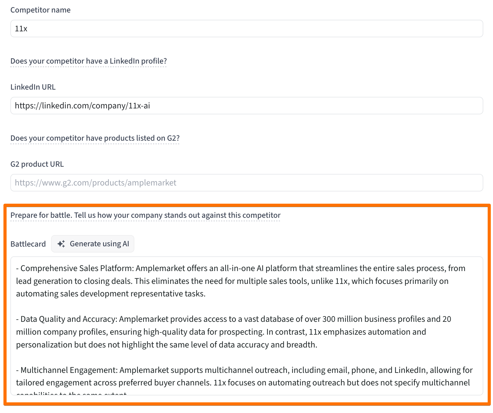 In Settings > Duo Control Center > Duo Copilot > Competitors, click to open one of your competitors. You'll see a text field at the bottom where you can inform Duo of how you compare against that specific competitor. This context will be used only for competitor related signals (e.g. when someone engages with a post from one of your competitors).