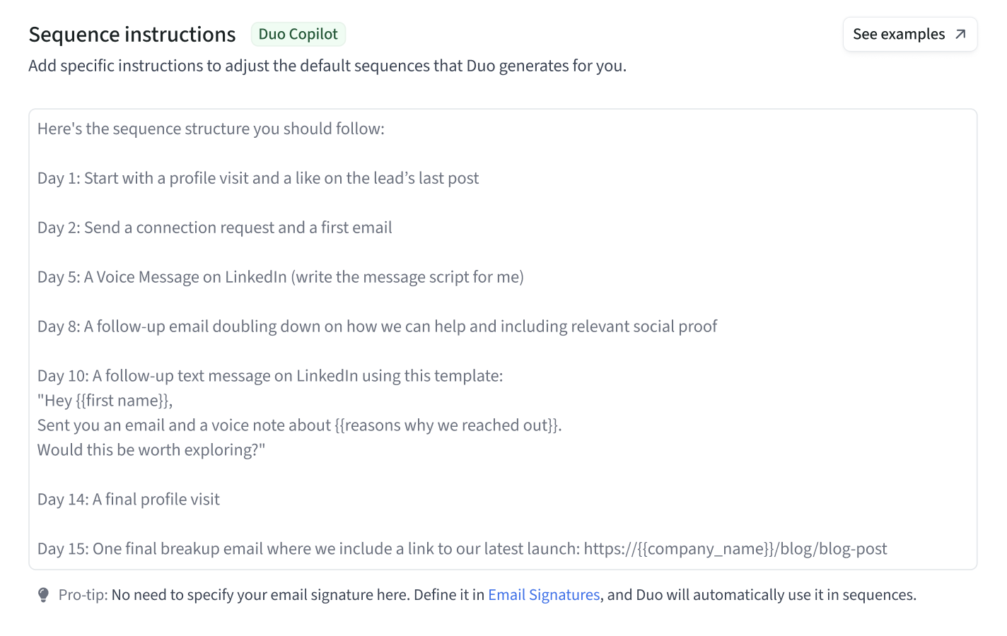 💡 Pro tip: You can also include links to sales decks, case studies, or demo videos in your instructions — Duo will understand where and how to use them in context.