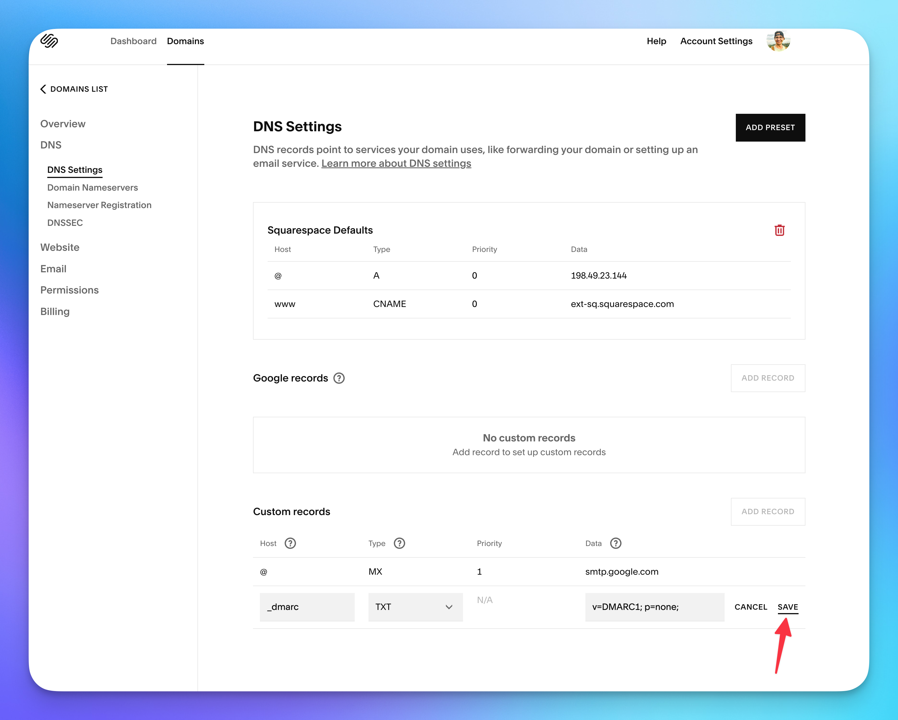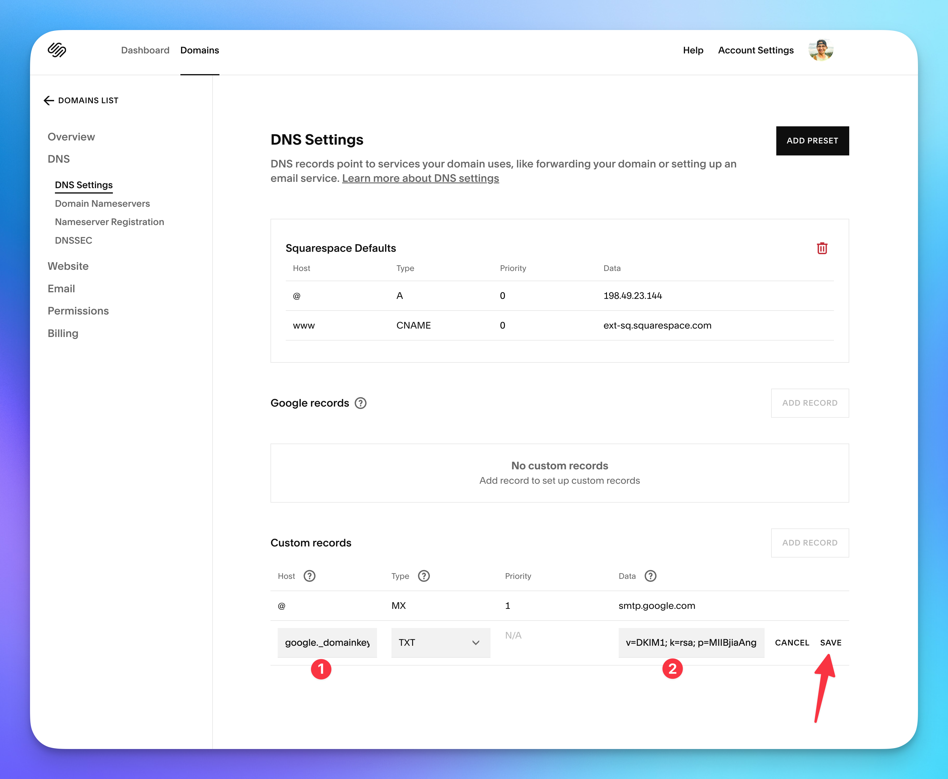 Now that you've generated the DKIM records on Google Workspace, you'll need to copy them over into SquareSpace to create a DNS record.