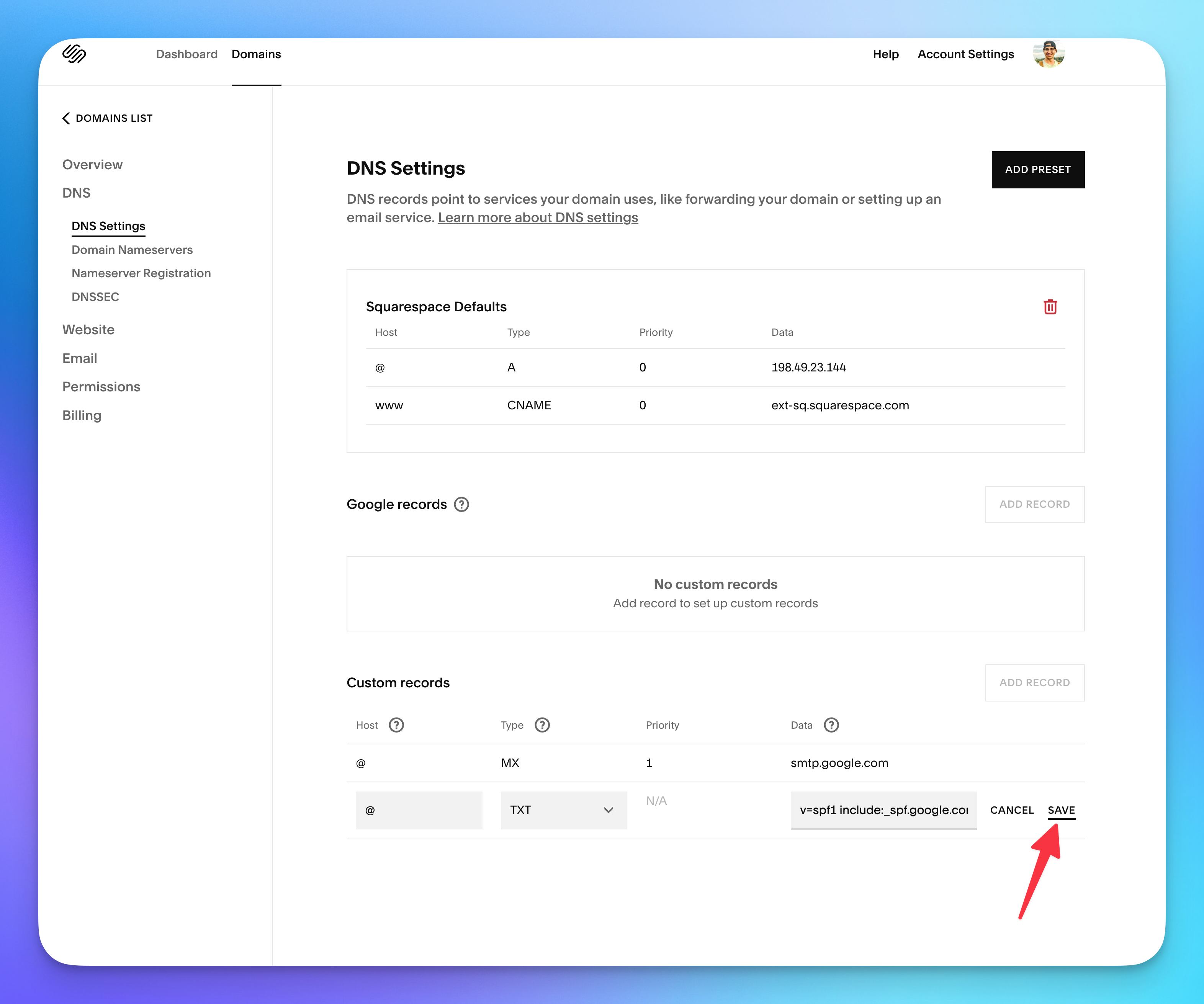 1. Copy record from Google Workspace to SquareSpace's DNS settings page