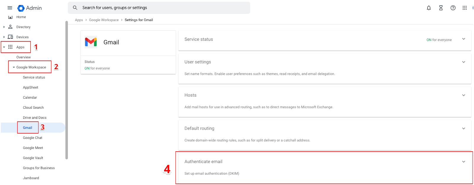 • Head to: Google Workspace > Gmail > Authenticate email
