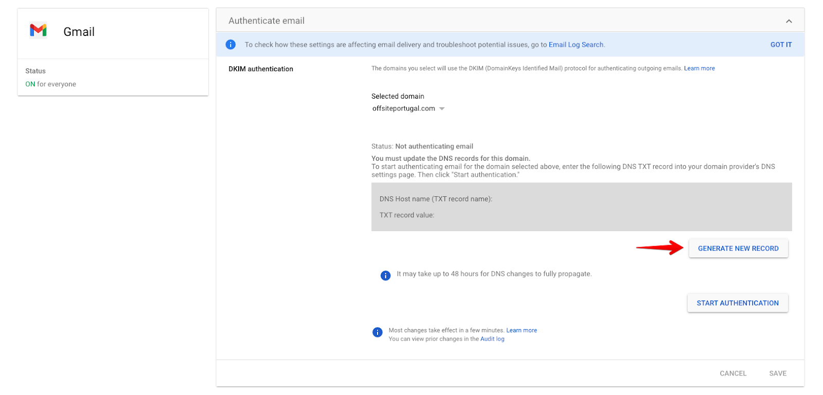 • Wait for the Success message from your domain provider and then head back over to the DKIM authentication page at Google and click the “Start Authentication” button. Allow it some time to complete, but if you receive an error message, know that it can take up to 48 hours to propagate, so it is okay to wait a while to reattempt. Once you can successfully receive the success message, then you have completed DKIM!
