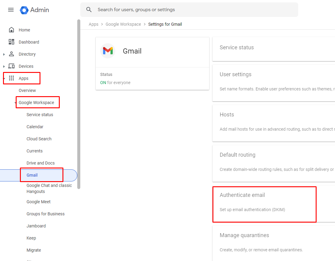 - Log into admin.google.com account and on the left navigation bar head to Apps > Google Workspace > Gmail > Authenticate Email (you can also find this easier by searching DKIM on the top search bar).