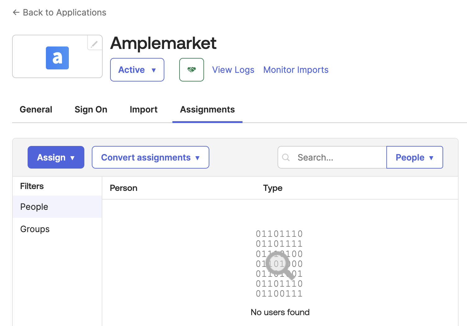Configure the users with access to the App to your desire. You can select all users, or make a group of Amplemarket users. Regardless of who you select they won’t be able to log in unless they have an existing account in Amplemarket as we do not do provisioning today. In addition, any Amplemarket user not listed in Okta will lose access to Amplemarket once the SSO is enabled on the Amplemarket end.