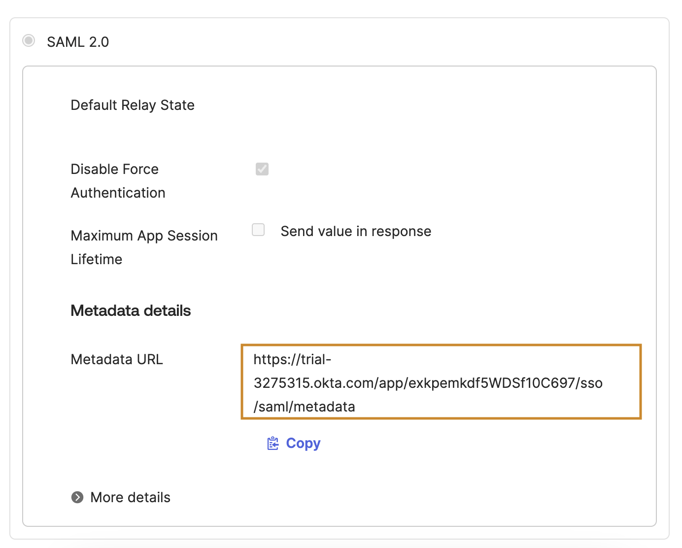 Scroll down to the SAML 2.0 section that holds the “Metadata Details”. Copy the “Metadata URL” and send it to support@amplemarket.com confirming that you want the Okta SSO enabled for your account!