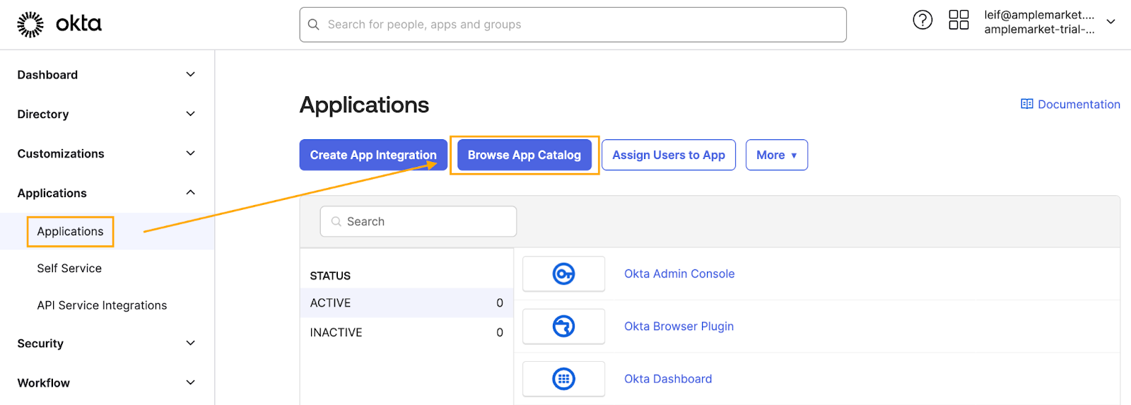 As an Okta Admin, log in to login.okta.com and navigate to the Admin Dashboard. From there, go to the Applications tab and click "Browse App Catalog"