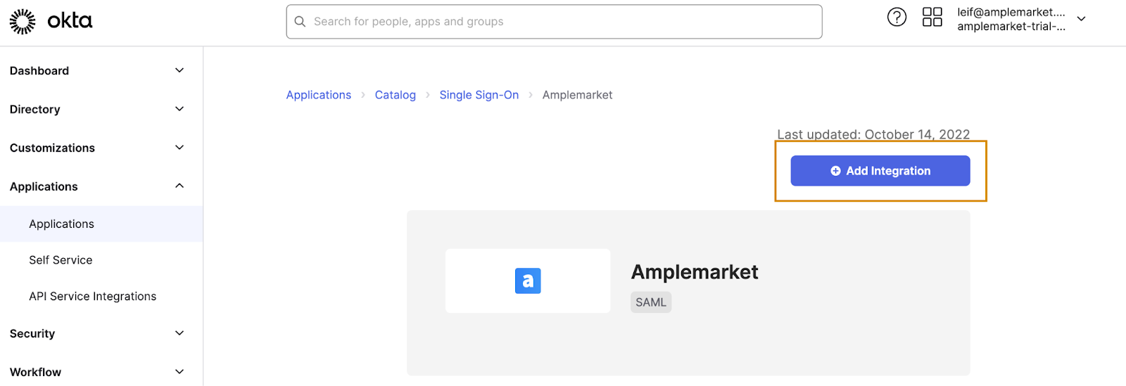 On the Amplemarket App page, select “Add Integration” to add this app to your Okta environment