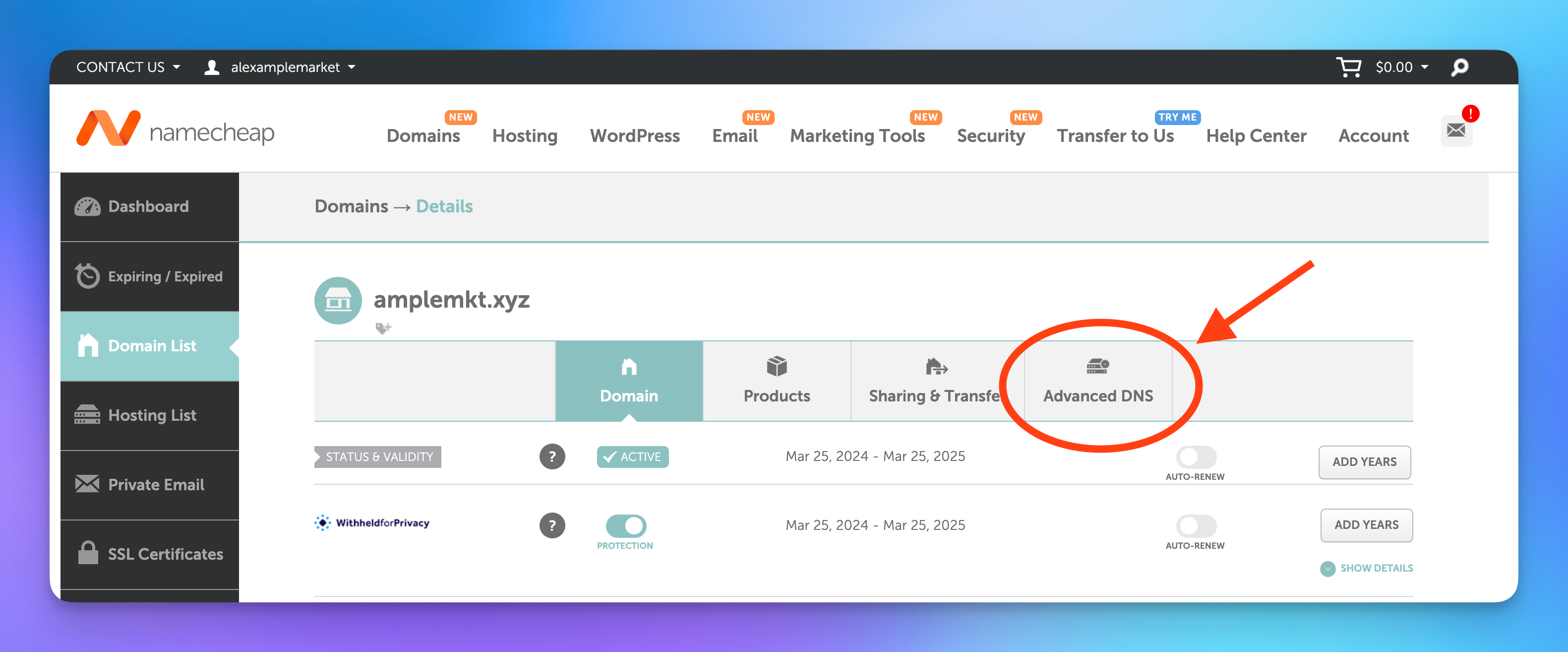 - Go to https://ap.www.namecheap.com/domains/list/, find your domain and press Manage