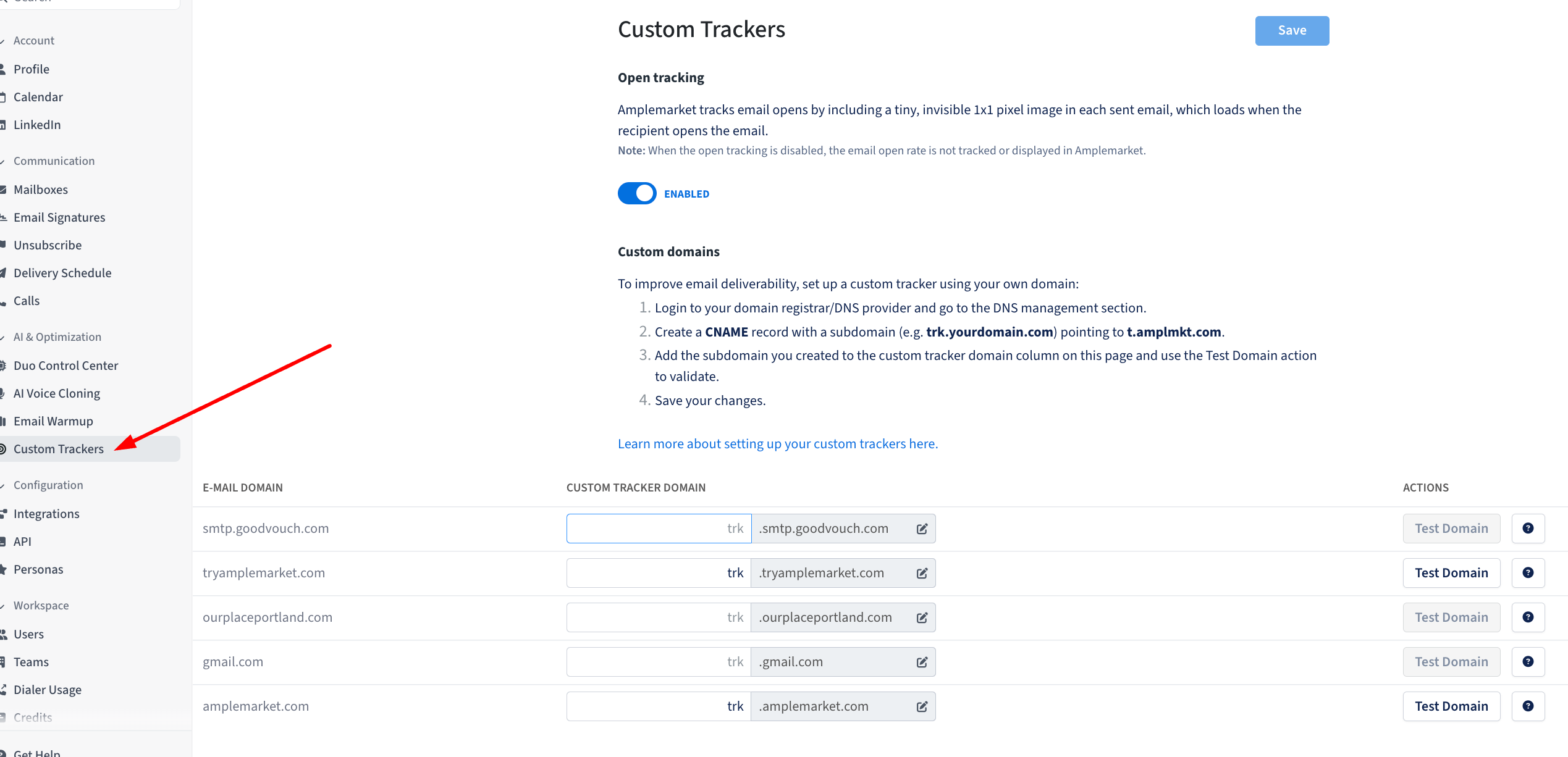 Set your Custom Tracker for your Domain, Test it, and Save