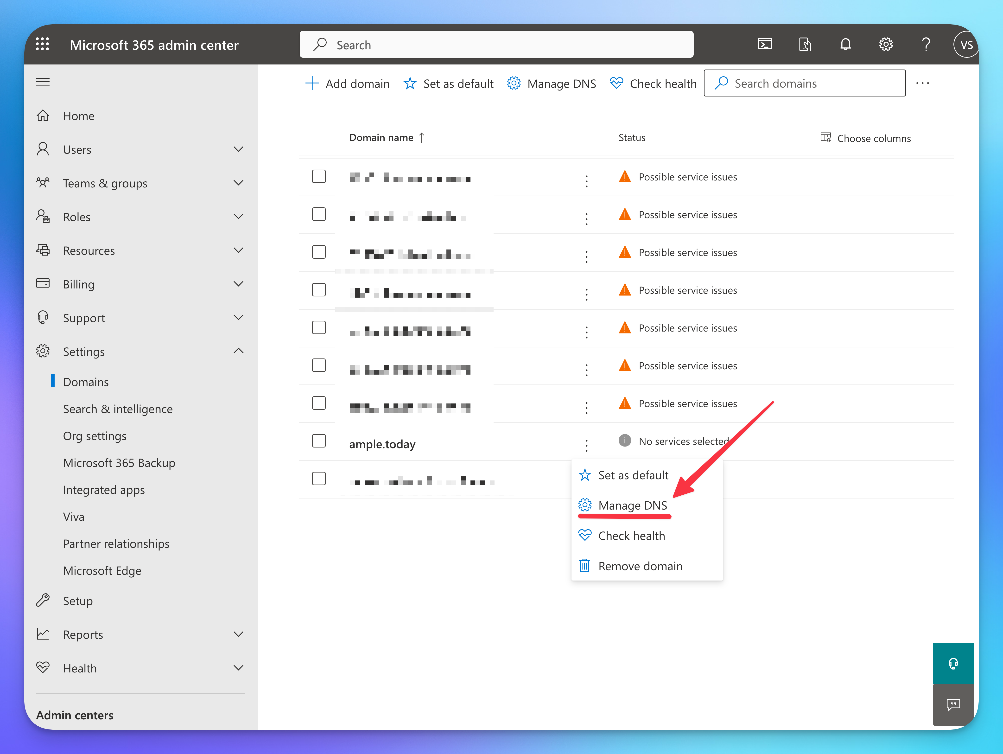 - Go to https://admin.microsoft.com/Adminportal/Home#/Domains, search for your domain and press Manage DNS.