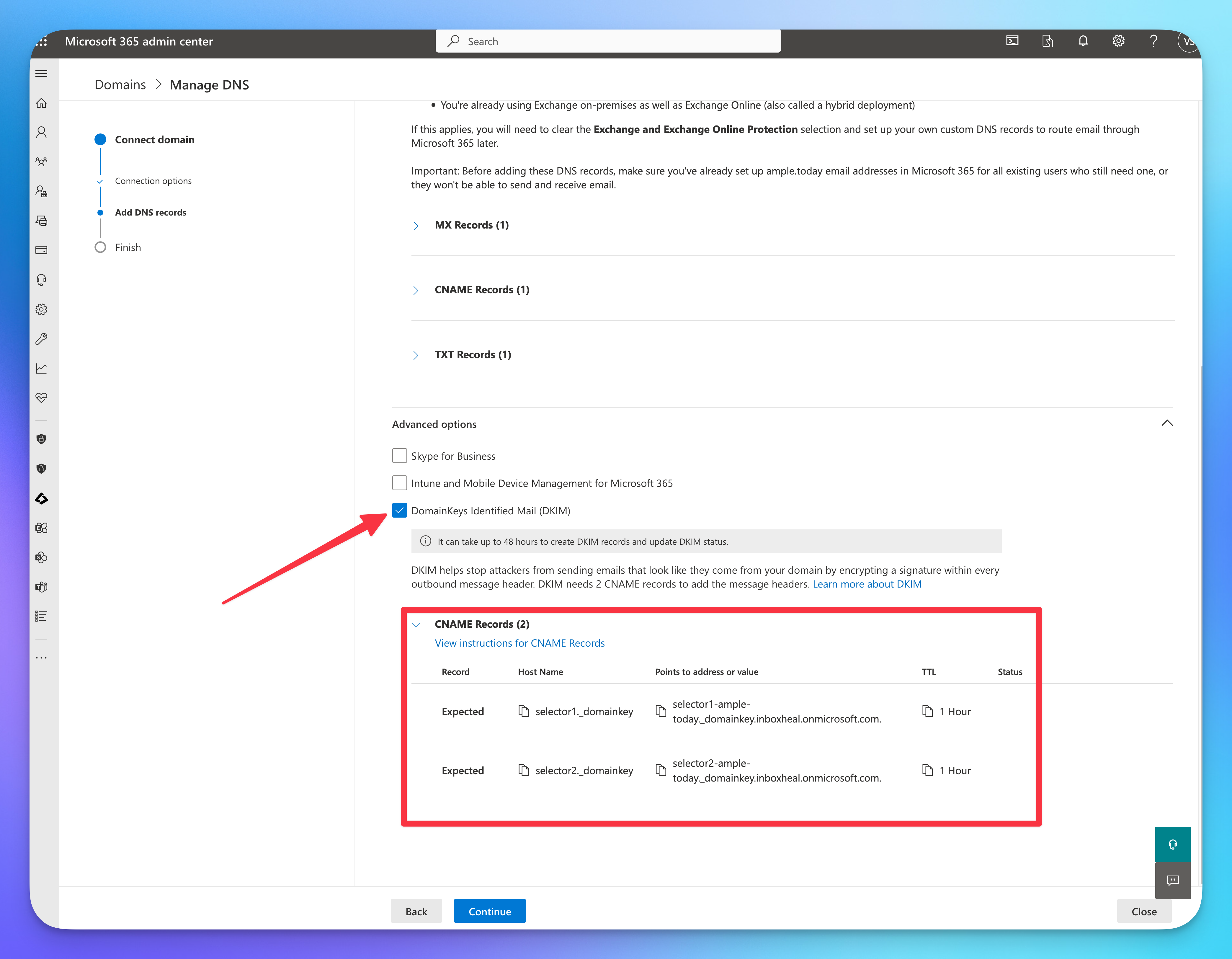 - Go to Advanced Options and make sure you check the DKIM records option